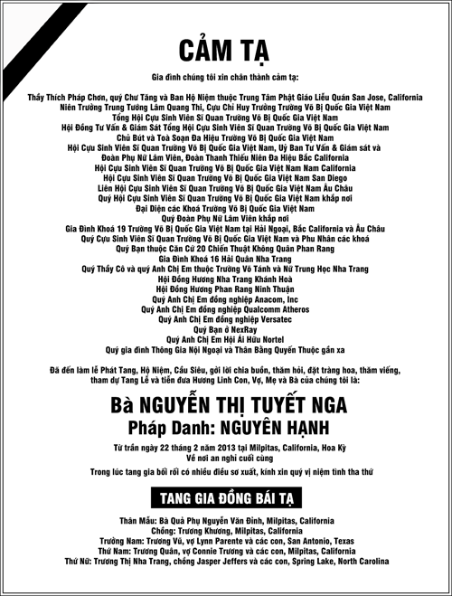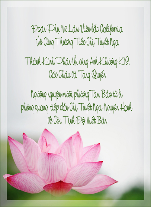 Trang chủ » Hội Võ Bị Bắc Cali » Thương Tiếc chị Tuyết Nga