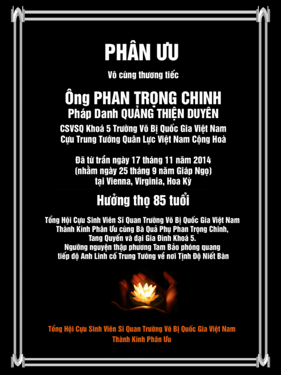 Trang chủ » Việt Nam Cộng Hoà » Quê Hương và Tổ Quốc » Sinh Hoạt » Phân Ưu cùng Tang Quyến cố Trung Tướng Phan Trọng Chinh K5