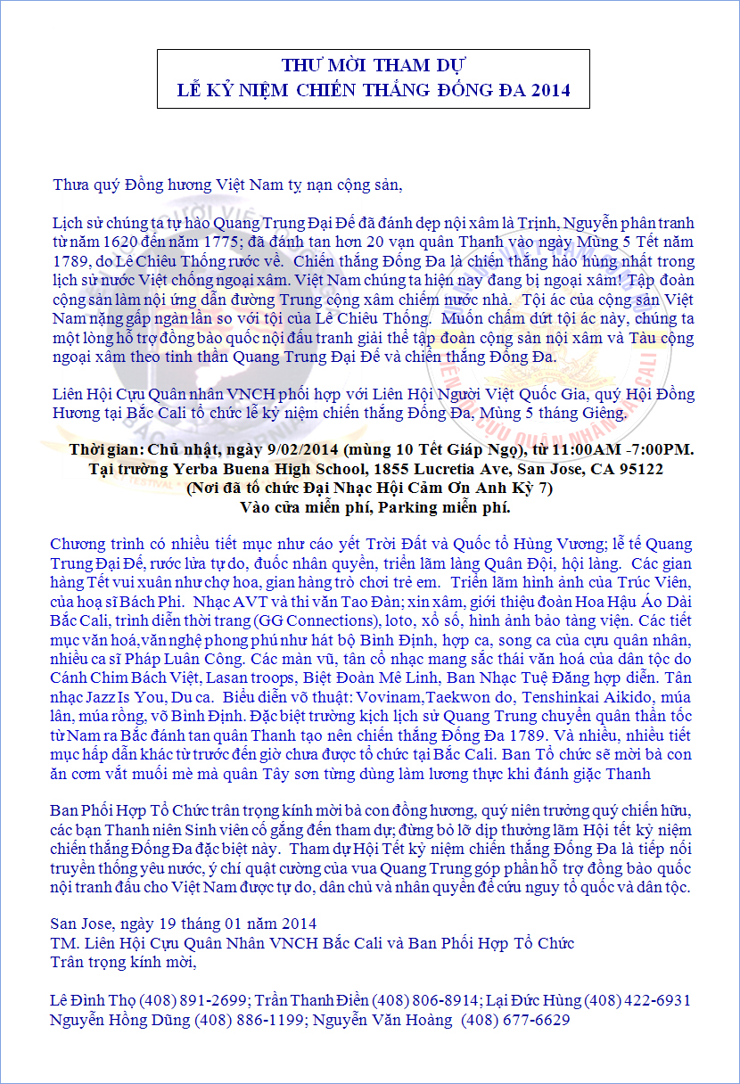 Thư Mời Tham Dự Lễ Kỷ Niệm Chiến Thắng Đống Đa 2014—Liên Hội Cựu Quân Nhân & Liên Hội Người Việt Quốc Gia