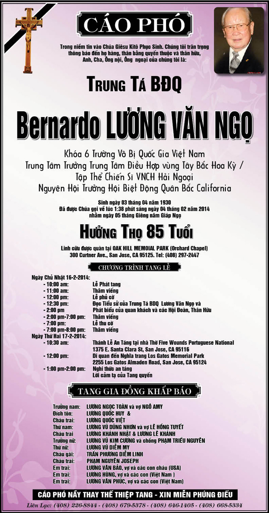 Trang chủ » Hội Võ Bị Bắc Cali » Hội Võ Bị Bắc Cali Phân Ưu cùng Tang Quyến Cố CSVSQ Lương Văn Ngọ K6