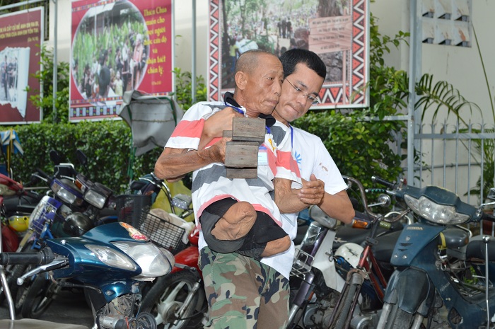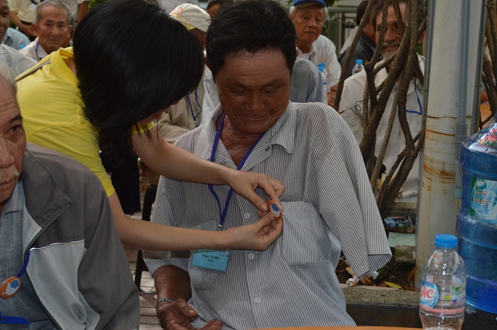 Một cộng tác viên đeo huy hiệu với dòng chữ “Tri ân quý ông thương phế binh 2014″ cho một thương phế binh