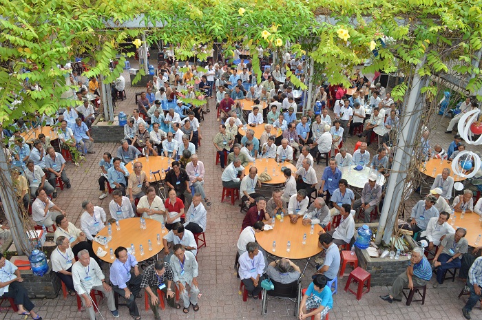 Khu vực sân Hiệp Nhất, quý ông ngồi uống nước, trao đổi với nhau về kỷ niệm xưa