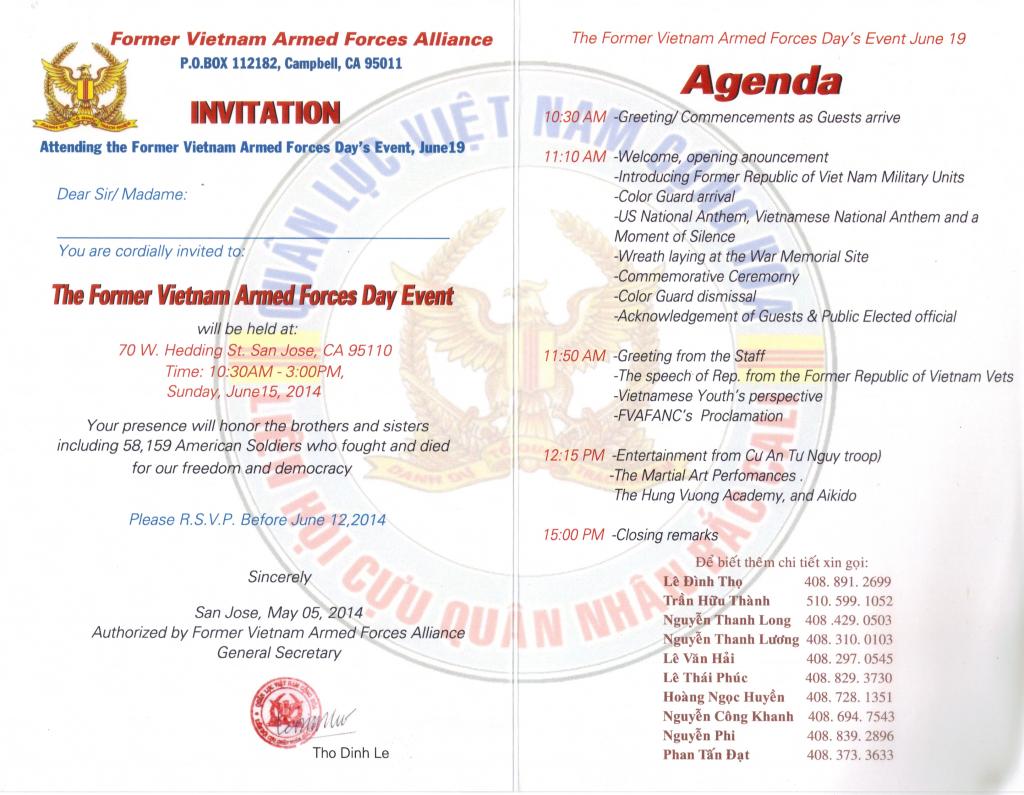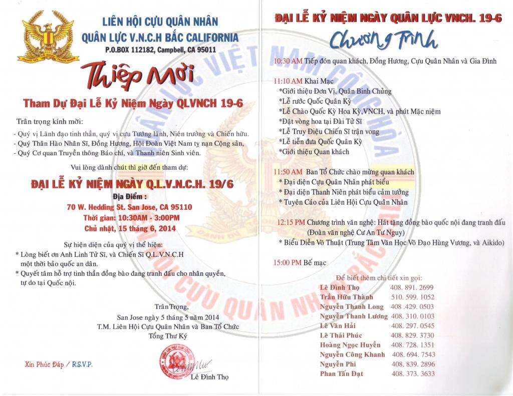 Thiệp Mời Tham Dự Lễ Kỷ Niệm Ngày Quân Lực 19/6—Liên Hội Cựu Quân Nhân VNCH