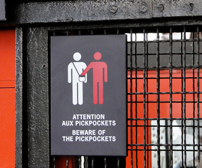 Bảng cảnh cáo coi chừng móc túi treo ở một cánh cổng tòa nhà gần tháp Eiffel. (Hình: http://www.clevertravelcompanion.com)