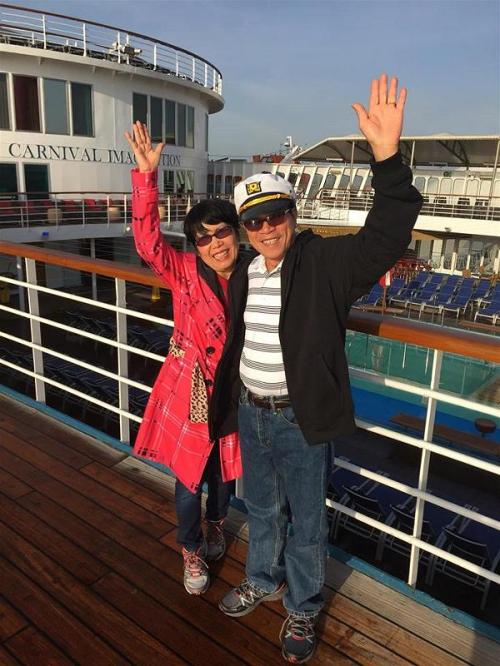 Theo thông báo, tàu sẽ khởi hành lúc 5:30 chiều. Nhưng chúng tôi đến cảng mới hơn11 giờ sáng,đã có nhân viên đón nhận hành lý,nói sẽ đưa qua check cổng an ninh dùm, rồi đem đến tận phòng. Chúng tôi rảnh taythong dong chụp vài tấm hình đầu tiên. Chiếc tàu to đến nỗi không thể nào thu hết vào ống kính, nhà tôi bèn chạy vào trạm quan sát nhờ người nhân viên trực chụp dùm một tấm rồi cùng tôi vô cổng xét an ninh. Sau đó lên tàu làm thủ tục nhận phòng. Tàu rộng thênh thang, cao14 tầng với nhiều trung tâm, hồ bơi, sòng bài, nhà hàng,khu giải trí,shopping, trung tâm thể dục…xen lẫn với nhiềudãy phòng ngủ nên phải mất một thời gian chúng tôi mới tìm được phòng của mình. Hai vali hành lý đã nằm sẵn trước cửa.