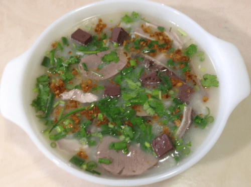 Cháo lòng thì ai cũng biết nhưng mỗi người một kiểu khác nhau, người thì quậy huyết vô cháo cho có màu cháo lòng đặc trưng cùng với đủ thứ lòng như tim gan, cật, phèo, bao tử, lá mía. Người thì luộc huyết chín rồi cắt từng miếng nhỏ, gạo thì rang vàng trước khi nấu. Riêng bà bếp này thì thích cho thêm thịt nạc vào nồi cháo và chỉ lấy hai món lòng là tim và bao tử mà thôi.