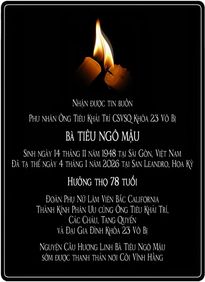 Trang chủ » Việt Nam Cộng Hoà » Quê Hương và Tổ Quốc » Sinh Hoạt » Phân Ưu Bà Tiêu Khải Trí K23/1