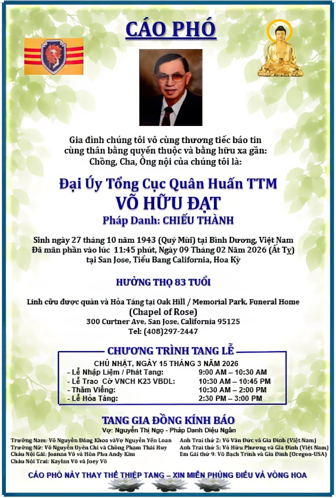 Mời click để xem: MỘT SỐ HÌNH ẢNH TANG LỄ ÔNG PHẠM ĐÔNG AN K25 TẠI SAN JOSE