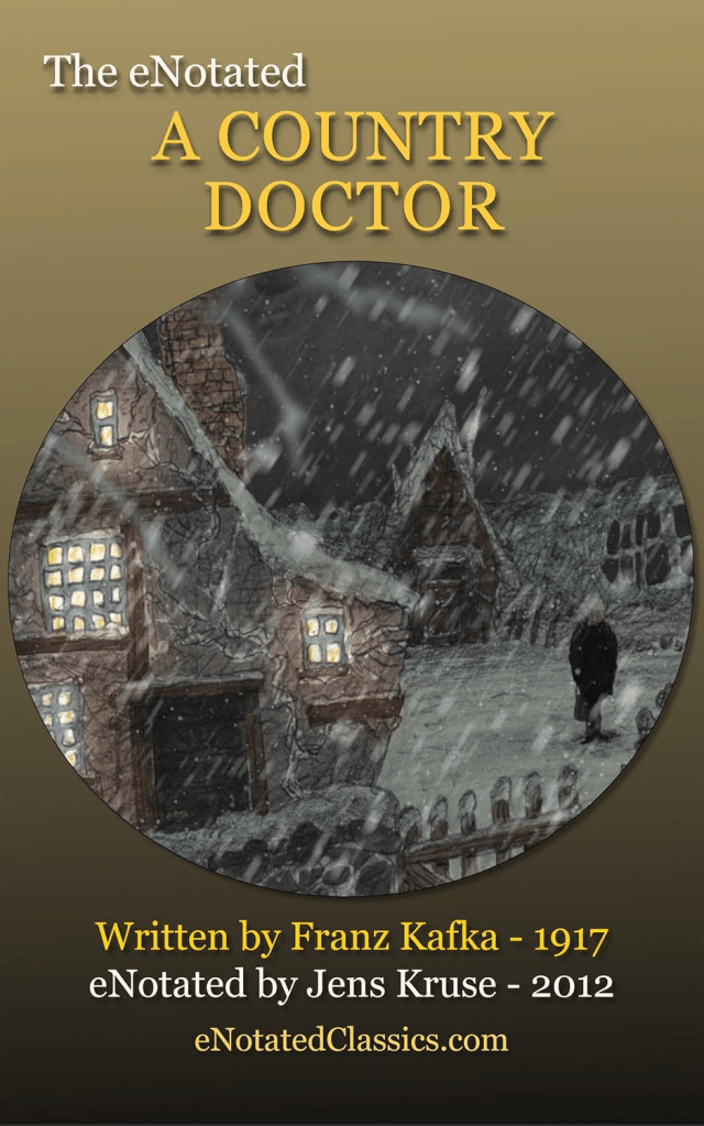 Trong truyện ngắn A Country Doctor của Franz Kafka có ông bác sĩ già cần phải đi chữa bệnh cho một người ở cách đó mười dặm nhưng con ngựa duy nhất của ông đã chết đêm qua vì kiệt sức. Cô gái giúp việc, Rose, đi khắp nơi đến nhà láng giềng để mượn ngựa cho chủ nhưng không ai cho mượn. Trong cơn tức bực, bác sĩ đá cánh cửa cái chuồng lợn, thì bỗng nhiên, có anh nài ngựa dẫn hai con ngựa lóp ngóp từ trong chuồng lợn bò ra. “Thật là người ta nhiều khi trong biết trong nhà người ta có chứa những gì.” Kafka tả, hai con ngựa cao lớn khỏe mạnh, nhưng ông không nói rõ ngựa màu gì. Koji Yamamura, đạo diễn Nhật, trong đoạn phim họa hình đã vẽ đôi ngựa màu đen.[ii] Anh nài ngựa bỗng dưng ôm chầm lấy Rose thô bạo cắn vào má cô nàng đến rướm máu. Bác sĩ muốn đánh tên nài ngựa để cứu Rose nhưng lại sợ hắn không cho mượn ngựa và có lẽ cũng vì hắn cường tráng mà ông thì già yếu hom hem. Bác sĩ lên đường một mình vì tên nài ngựa tuyên bố ở lại để chiếm đoạt Rose. Đôi ngựa tự động mang bác sĩ đi đến một nơi quang đãng, xa mười dặm mà đi trong chớp mắt. Bệnh nhân là một cậu bé mười một tuổi, gầy gò xanh xao nhưng không bị sốt. Bác sĩ cho là bệnh của cậu không nguy hiểm và đôi ngựa thò đầu vào cửa sổ khiến Bác sĩ nghĩ đến Rose đang cần được ông cứu. Sau tiếng ngựa hí Bác sĩ tìm thấy bên hông của cậu bé có một vết lở to như cái hoa hồng, bên trong đóa hoa hồng này là những con dòi to bằng ngón tay út, đầu trắng và có nhiều chân. Dân làng tụ họp trước nhà bệnh nhân xông vào cởi quần áo của Bác sĩ và đặt ông lên giường của bệnh nhân vì ông không chữa được bệnh và phải bị giết, y như lời hát của một bài đồng dao. Bác sĩ ném quần áo ra cỗ xe ngựa ngoài cửa sổ và trốn về. Trên đường về Bác sĩ già trần truồng và hai con ngựa lê bước chậm chạp trong cơn bão tuyết.