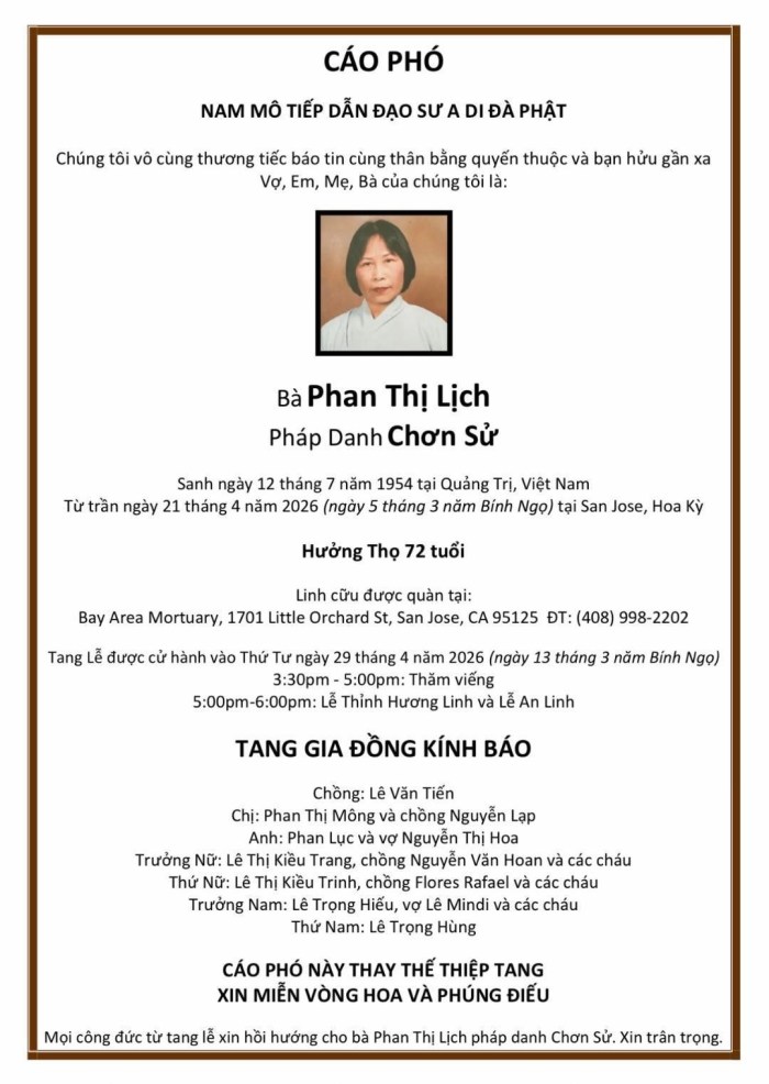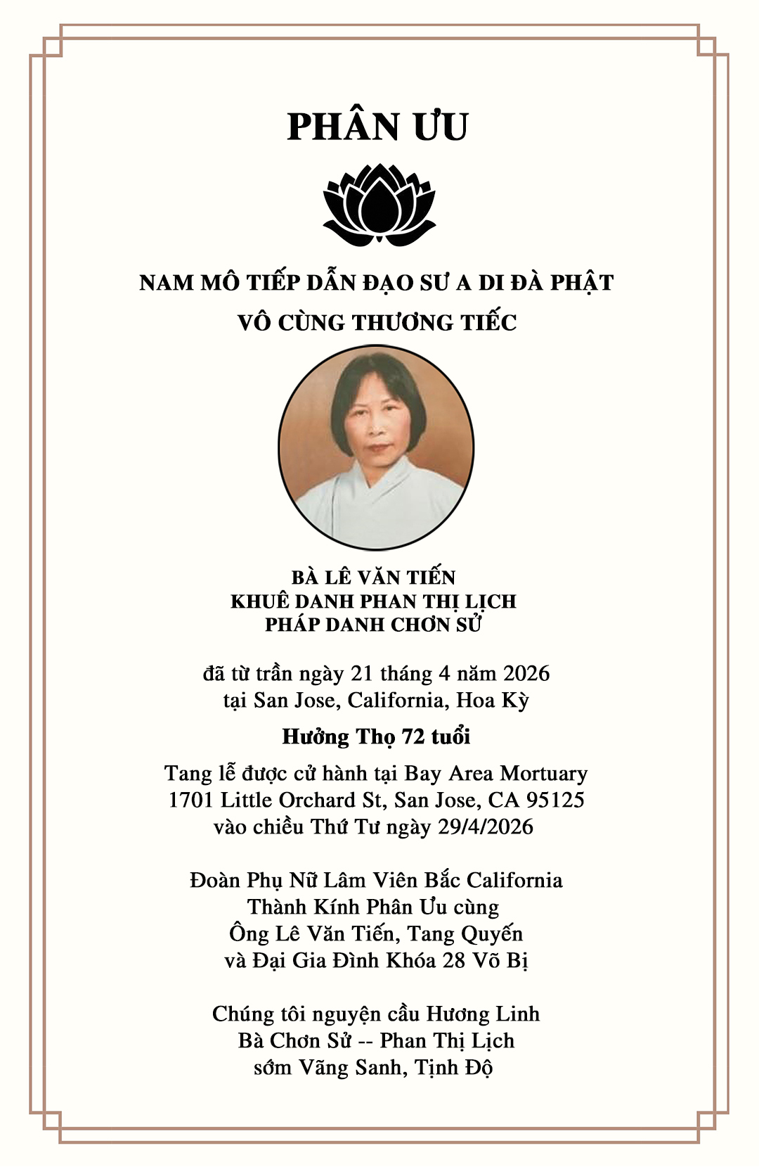 Trang chủ » Việt Nam Cộng Hoà » Quê Hương và Tổ Quốc » Sinh Hoạt » Phân Ưu Bà Lê Văn Tiến—Khuê Danh Phan Thị Lịch K28/1