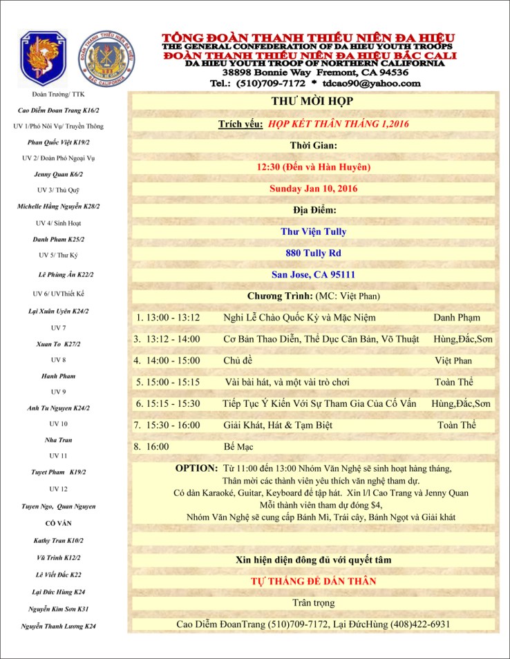 Đoàn Phụ Nữ Lâm Viên bắc Cali thân kính mời quý phu nhân, quý chị vui lòng tới tham dự buổi sinh hoạt của Đoàn được tổ chức vào lúc 11 giờ trưa ngày Chúa Nhật 24/05/15 tại: