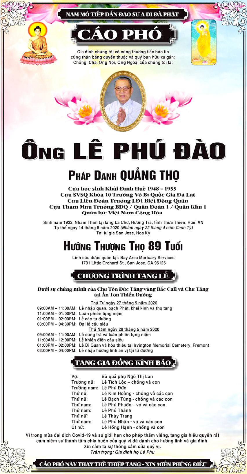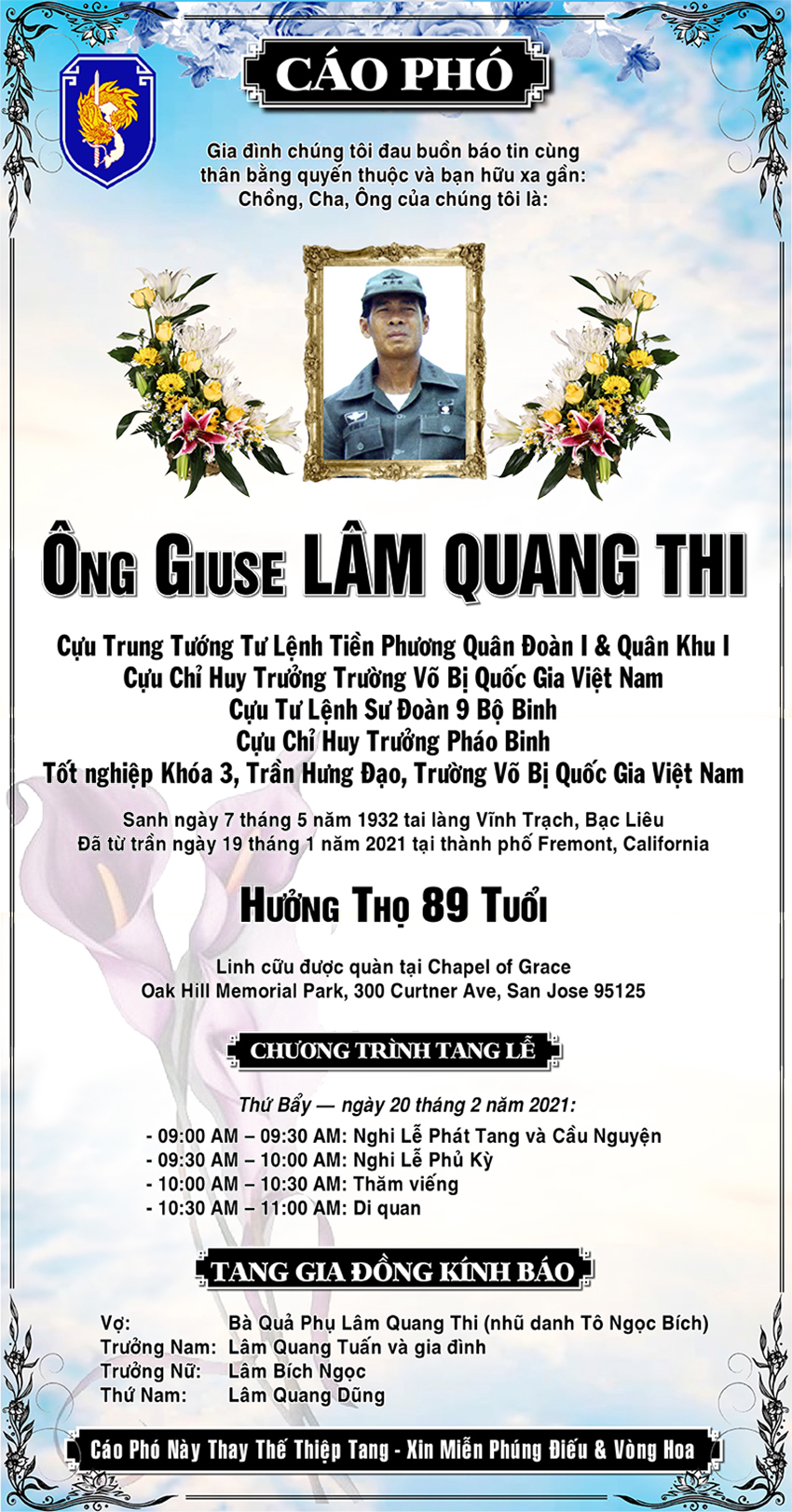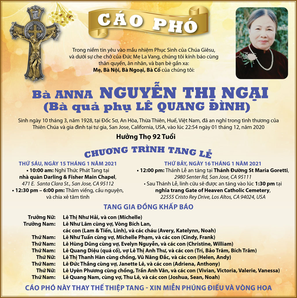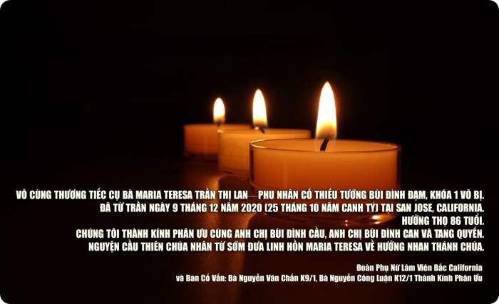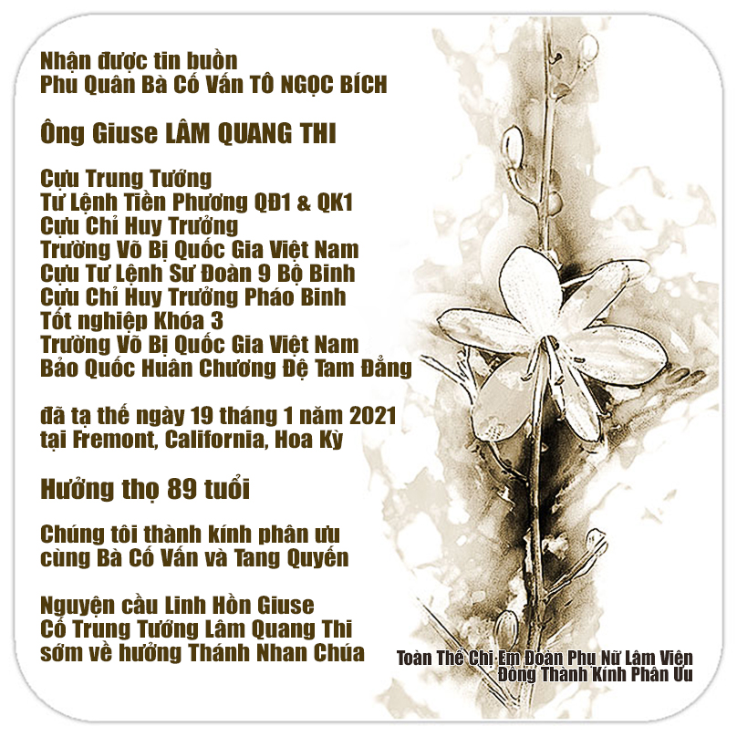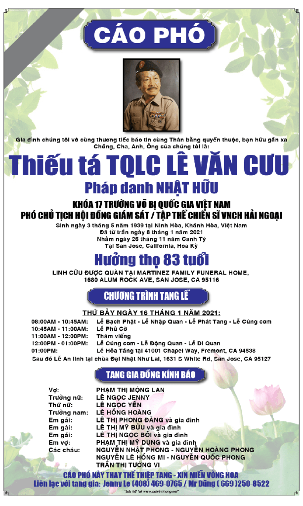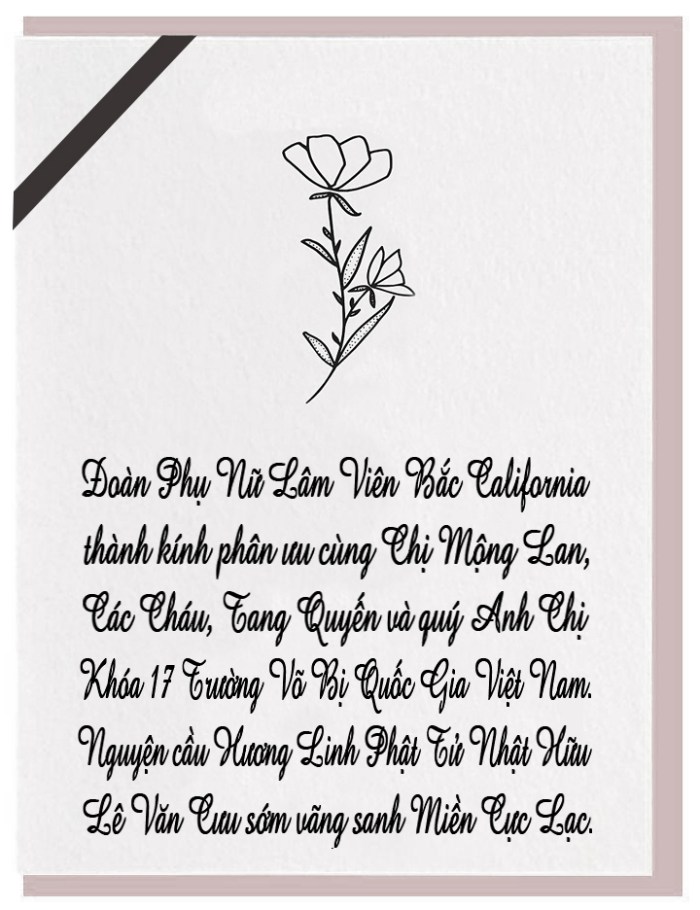 Xin mời quý vị gởi lời phân ưu, an ủi, add a memory, write guest book, send flowers, v.v… đến Tang Quyến Anh Nguyễn An Cảnh Khóa 13 tại đây: Charlie Nguyen Obituary